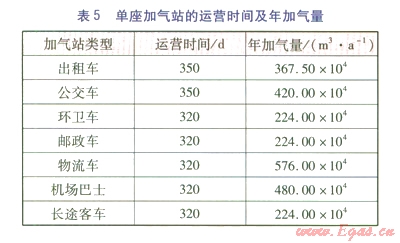 30%資本金考慮,其余為國內(nèi)商業(yè)銀行貸款,貸款利率為7.05%。單座加氣站的運營時間及年加氣量見表5。