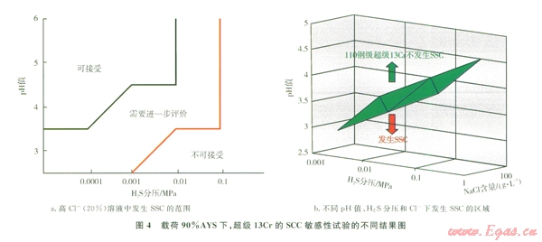 Cooling等人[10-11]通過按照NACE TM0177標準恒載荷、SSRT等方法,對超級13Cr在加載90AYS條件下的SSC研究認為:當Cl-≤1 000 mgL(氣井典型凝析水)pH≥3.5、pH2S≤0.1 MPa時;或當65 200 mgLCl-≤140000 mgL(油氣井典型地層水),pH值為4.04.3、pH2S≤0.005 MPa時,超級13Cr不發(fā)生SSC,如圖4(a)所示。而Marchebois等人[12]結合工程實際,綜合考慮pH值、H2S分壓和Cl-含量,試驗得出超級13CrSSC敏感區(qū)域,其指導性更強,如圖4(b)所示。