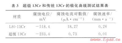 極化曲線測試結果如圖l、表3所示??梢钥闯觯?span lang="EN-US">l3Cr的腐蝕電位較傳統(tǒng)的L80-13Cr顯著正移,其腐蝕速率更是遠小于L80-13Cr的腐蝕速率,僅為0.01 mma。