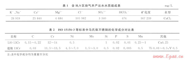 陜北地區(qū)某區(qū)塊氣井產(chǎn)水量大、產(chǎn)出水C1-含量高(超過l00 gL),特別是其H2S分壓達到0.15MPa,CO2分壓為1.8 MPa。為保證井筒管柱的長期安全,就超級13Cr和傳統(tǒng)13Cr管材的性能和適應性進行對比評價。表l為該區(qū)塊氣井產(chǎn)出水的水質(zhì)情況,表2ISO標準所規(guī)定的兩種材料的化學成分對比。