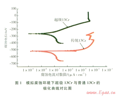 采用Princeton-M370電化學測試系統(tǒng)對超級13C和傳統(tǒng)L80-13Cr試樣進行極化曲線測試,測試范圍:相對于自腐蝕電位的-l50+350 mV,掃描速率0.166 mVs,電化學試樣規(guī)格為øl4 mm×3 mm,常溫。試驗介質(zhì)同表l。