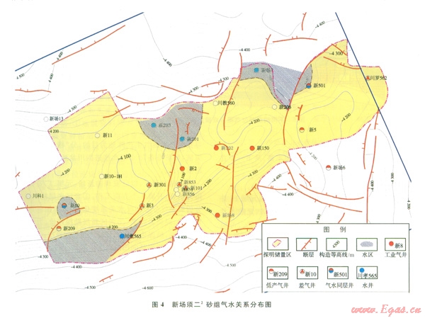 圖4顯示,新場氣田須二2砂組在氣藏較高部位還存在局部水區(qū),在南北均存在邊水且各井區(qū)氣水界面不同,這些現(xiàn)象充分說明氣藏沒有統(tǒng)一的氣水關(guān)系。