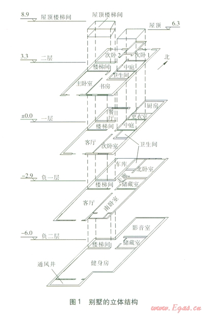 該建筑物共有21個主要功能房間(包含衛(wèi)生間、車庫、儲藏室等),兩個豎向氣流通道(樓梯間、中庭)。樓梯間是貫通負(fù)二層至屋頂?shù)娜诵型ǖ馈V型囊粚油ㄖ廖蓓?,類似于舊式建筑的天井,是與室外相通的空間。別墅的立體結(jié)構(gòu)見圖1,圖中各層標(biāo)高的單位為m。