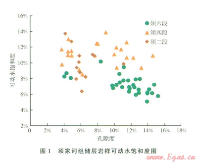 1)廣安須六段儲層可動水飽和度最低,須四段儲層可動水飽和度最高,須二段儲層可動水飽和度介于兩者之間。