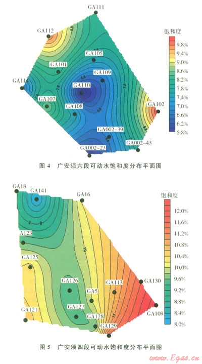 繪制了廣安氣田兩個主力區(qū)塊須家河組儲層可動水飽和度平面分布圖,包括廣安2井區(qū)須六段120 km2和廣安106井區(qū)須四段400 km2儲層。