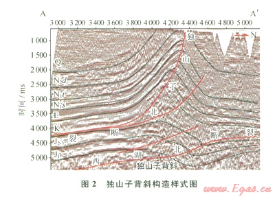 圖2顯示了獨山子北斷裂沿白堊系吐谷魯群泥巖層滑脫,向上突破進(jìn)入古近系地層,控制了獨山子背斜斷層傳播褶皺的發(fā)育。獨山子背斜中淺層為典型的斷層傳播褶皺。其特點為:①背斜后翼模擬下盤斷坡產(chǎn)狀;②形成向斷層運(yùn)動方向傾倒的不對稱背斜;③常有突破斷層發(fā)育;④突破斷層位移量很小[4]。