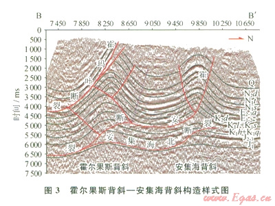 南緣沖斷帶霍、瑪、吐構(gòu)造深層發(fā)育三角楔構(gòu)造。圖3為過霍爾果斯與安集海背斜的一條區(qū)域剖面?;魻柟贡承鄙畈康臉?gòu)造三角楔由霍安斷裂與一個反向沖斷層組成。沿中下侏羅統(tǒng)發(fā)育的滑脫斷層向上突破白堊系,再沿白堊系滑脫,前鋒向上突破控制了北部安集海背斜中淺層背斜特征?;舭矓嗔言诨魻柟贡承毕蛏贤黄瓢讏紫档倪^程中(前沖斷層),同時伴生一個反向的沖斷層(反沖斷層),形成霍爾果斯背斜深部構(gòu)造三角楔??梢钥闯鰳?gòu)造三角楔前端向斜軸面位置與三角楔前緣端點位置一致,符合構(gòu)造三角楔幾何變形原理。