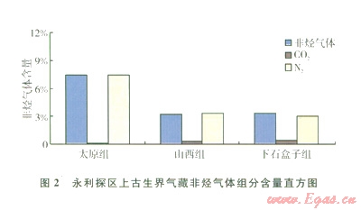 本區(qū)上古生界天然氣中含量最高的非烴氣體為氮氣,含量一般在3%以上。太原組天然氣組分中氮氣含量為7.36%;山西組氣藏中氮氣含量有所降低,分布范圍為2.15%~3.41%,均值為2.88%;下石盒子組氮氣含量與下部的山西組氣藏相近,均值為3.Ol%(表1、圖2)。這一分布特征與區(qū)塊北部的天環(huán)北段和橫山堡氣田的天然氣中氮氣含量近似,要高于榆林、神木、米脂等氣田。由此可見,構(gòu)造活動較為強烈的西緣逆沖帶為整個鄂爾多斯盆地氮氣含量相對較高的區(qū)域。這一現(xiàn)象說明天然氣中氮氣含量的增加主要與氣藏的保存條件有關(guān),但也可能有深大斷裂造就的深源氮氣的貢獻。