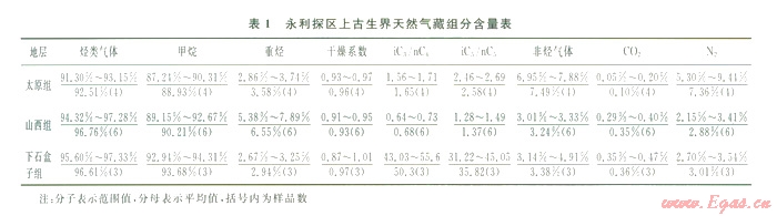 1)永利探區(qū)上古生界氣藏天然氣組分以烴類氣體為主,甲烷為烴類氣體的主要組分,其含量多超過90%,非烴氣體以氮氣為主,極少量為二氧化碳;氣藏的重烴含量不高,干燥系數(shù)較高,氣藏總體上偏干,下石盒子組天然氣曾經(jīng)經(jīng)歷過較明顯的分餾作用。