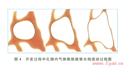 氣藏開發(fā)過程中,隨著儲層壓力逐步下降,壓力降傳導到孔隙內的氣體時,氣體體積迅速膨脹,對孔隙表面水相進行擠壓,并對微細孔喉處的水相產生推動力,這種推動力只要大于某一微細孔喉處的毛細管力束縛,則這部分微細孔喉處及其控制的孔隙內的殘余水就會被推動,從而運移產出成為可動水(圖4)。另一方面,開發(fā)過程遠遠快于成藏過程,因而開發(fā)過程中驅替壓力梯度大于成藏過程中的驅替壓力梯度,故成藏過程中部分末被驅出的水相可以在開發(fā)過程被驅替出,成為可動水。對于須家河組氣藏而言,由于微細孔喉發(fā)育,殘余水飽和度較高,衰竭式開發(fā)過程中壓力梯度大,因而可動水產出量較大,嚴重影響氣藏產能。