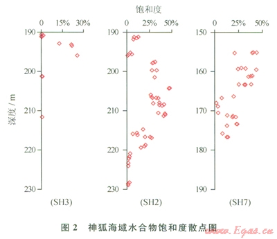 圖2是神狐海域SH3、SH2和SH7站位現(xiàn)場測試的水合物飽和度散點圖。SH3站位含水合物層較薄,水合物集中分布在192~196m段,最高飽和度值出現(xiàn)在196m處,飽和度值為25.5%,與聲波曲線高值段相對應(yīng),含水合物層的最高聲速值為205lm/s。SH2站位含水合物層大約有30m厚,水合物集中分布在海底l90~220m,該站位水合物飽和度相對較高,超過l5%高飽和度水合物主要集中在197~220m段,飽和度值為15%~47%,平均為29%。該深度段的聲波速度值相對較高,含水合物層的最高聲速為2279m/s。SH 7站位水合物層大約有22m厚,水合物集中分布在海底l55~177m。與SH2站位相似,該站位水合物飽和度較高,水合物的分布主要分為2段,l55~164m為高飽和度值段,水合物的飽和度為25%~44%,平均為34%,該深度段的聲波速度值整體較高,最高聲速為2578m/s;而l66~177m深度段的水合物飽和度相對較低,飽和度值為3%~23%,平均為l4%,該深度段的聲波速度值有下降的趨勢,最高聲速為2256m/s。