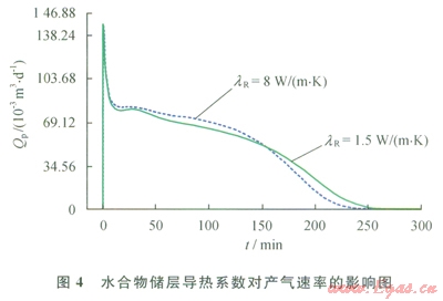 導(dǎo)熱系數(shù)是指水合物儲(chǔ)層傳播熱量的能力。水合物分解是一個(gè)吸熱過程,對于水合物地層,若其導(dǎo)熱系數(shù)大,則在單位時(shí)間多孔介質(zhì)中有更多的熱量傳遞到水合物分解前緣,對水合物分解有更好的促進(jìn)作用。圖4顯示了地層導(dǎo)熱系數(shù)(lR)分別為1.5 W/(m·K)和8W/(m·K)條件下水合物藏產(chǎn)氣速率隨時(shí)間變化的關(guān)系[28]??梢园l(fā)現(xiàn),在其他參數(shù)相同的條件下,在開采的前期,隨著地層導(dǎo)熱系數(shù)的增加,水合物產(chǎn)氣速率增加;開采后期隨著地層導(dǎo)熱系數(shù)的增加,水合物產(chǎn)氣速率反而減小,但導(dǎo)熱系數(shù)對水合物藏產(chǎn)氣速率的總體影響很小。