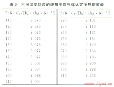 對(duì)于hBt的確定,首先通過(guò)EPCON Engineer′s Aide Toolbox 7.0軟件查詢(xún)出理想甲烷氣體不同溫度時(shí)所對(duì)應(yīng)的比定壓熱熔Cp(表3),再運(yùn)用matlab擬合出Cp與T的關(guān)系函數(shù)。