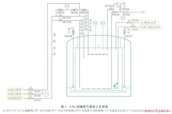 由于常溫下甲烷的密度比氮?dú)庑?,為了達(dá)到較好的置換效果,通常采用上進(jìn)下排的方式進(jìn)行氮?dú)庵脫Q,同時(shí)保證儲(chǔ)罐壓力穩(wěn)定[4]。圖l為LNG儲(chǔ)罐氮?dú)庵脫Q工藝簡(jiǎn)圖,如圖l所示,置換用的BOG進(jìn)入進(jìn)料總管,通過(guò)頂進(jìn)料管線到達(dá)罐內(nèi),將罐內(nèi)的氮?dú)馔ㄟ^(guò)MV06閥放空排放,環(huán)隙的氮?dú)馔ㄟ^(guò)MV07和MV08閥放空排放。在氮?dú)庵脫Q過(guò)程中定期檢查放空處的甲烷含量,當(dāng)甲烷體積分?jǐn)?shù)達(dá)到5%時(shí)關(guān)閉放空閥門(mén),氮?dú)庵脫Q完成。氮?dú)庵脫Q的同時(shí),BOG會(huì)逐漸完成進(jìn)料總管的冷卻。為了避免管道和支架的應(yīng)力過(guò)大,溫降通常控制在-10℃/h以?xún)?nèi),當(dāng)進(jìn)料總管頂端溫度下降至-l00℃時(shí),進(jìn)料總管冷卻完成。當(dāng)?shù)獨(dú)庵脫Q和進(jìn)料總管冷卻完成后,便可以對(duì)進(jìn)料總管進(jìn)行充液。
