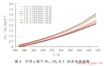 由于冷卻速度不同會(huì)導(dǎo)致瞬時(shí)進(jìn)入儲(chǔ)罐的LNG流量和冷卻所需的LNG需求量不同,同時(shí)導(dǎo)致瞬時(shí)排出儲(chǔ)罐的BOG流量和冷卻過(guò)程總共排出的BOG量也不同。當(dāng)儲(chǔ)罐壓力為111kPa,環(huán)境溫度為293K,儲(chǔ)罐冷卻初始溫度為293K,冷卻速度分別為-1.5K/h、-2.5 K/h、-3.5K/h、-4.5K/h時(shí),冷卻過(guò)程中冷卻時(shí)間(t)與LNG流量(MLt)、排放BOG流量(MBt)間的關(guān)系如圖3所示,冷卻過(guò)程中儲(chǔ)罐溫度(Tt)與LNG流量(MLt)、排放BOG流量(MBt)間的關(guān)系如圖4所示。
