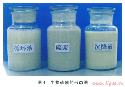 生物硫磺的生成機(jī)理和化學(xué)硫磺的生成機(jī)理不同[23],微生物通過自身特殊代謝過程,將生成的硫磺排出體外,同時(shí)又和微生物包裹在一起,因而硫磺在溶液中以乳濁液的形式存在,具有親水性(圖4)。通過實(shí)驗(yàn)測(cè)定了生物硫磺的密度、黏度和粒徑等物化指標(biāo),為生物硫磺后期處理方法的選擇提供了重要參考依據(jù)。