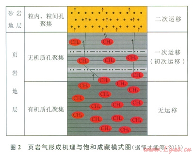 烴源巖排烴后烴類氣體(主要是甲烷)基本無運(yùn)移或頁巖層內(nèi)短距離運(yùn)移,屬于“自生自儲”,而常規(guī)天然氣要經(jīng)過二次運(yùn)移,從生氣層運(yùn)移到儲氣層(圈閉)中聚集成藏(圖2)。