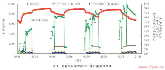 中國石油天然氣股份有限公司(以下簡稱中國石油)已在四川的長寧、威遠(yuǎn)、富順、永川,云南昭通等開展頁巖氣勘探開發(fā)。其中我國第一口頁巖氣水平井——威201-H1井于位于四川盆地南部,2011年2月完鉆,井深2835.6m,水平段長1079m;分11段壓裂,加石英砂584.6m3,入地總液量23654m3,井下微地震監(jiān)測顯示,初步達(dá)到了規(guī)模體積壓裂的效果,目前日產(chǎn)氣量l3×104m3。中石油與殼牌合作區(qū)塊的水平井陽201井,測試平均日產(chǎn)氣量為45.0×104m3,井口套壓48.3MPa,表現(xiàn)出良好的高產(chǎn)潛力(圖3)。