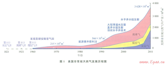 全球范圍內(nèi),常規(guī)油氣資源非常豐富,但非常規(guī)油氣資源更加豐富,據(jù)美國地質(zhì)調(diào)查局(USGS)和美國能源部能源信息署(EIA)2009年估計(jì),全球非常規(guī)石油(重油、天然氣瀝青和頁巖油等)可采資源量約為4495×108t,與常規(guī)石油資源基本相當(dāng);全球非常規(guī)天然氣(煤層氣、致密砂巖氣、頁巖氣和天然氣水合物等)可采資源量為4000×1012m3,是常規(guī)天然氣資源量的8倍左右。目前非常規(guī)油氣的開發(fā)利用技術(shù)日趨成熟,已成為常規(guī)石油天然氣最現(xiàn)實(shí)的接替資源。美國頁巖氣、致密氣、煤層氣、致密油,加拿大油砂油、煤層氣,巴西和墨西哥灣深海油氣、委內(nèi)瑞拉重油等的規(guī)模開發(fā),使兩半球非常規(guī)油氣產(chǎn)量快速增長。2011年,全球非常規(guī)天然氣產(chǎn)量迅速上升到4000×108m3/a,非常規(guī)天然氣已經(jīng)成為一支不容忽視的能源新力量。美國是全球非常規(guī)天然氣開發(fā)利用的領(lǐng)軍國家,其非常規(guī)天然氣的勘探開發(fā)歷經(jīng)百年,規(guī)模開發(fā)探索了30年,近10年獲得了迅速發(fā)展(圖1),2011年非常規(guī)天然氣產(chǎn)量達(dá)3628×108m3,占其天然氣總產(chǎn)量的55.7%。