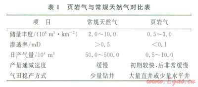 頁巖氣一般具有“低豐度、低滲透率、低產(chǎn)量”的特點(diǎn),與常規(guī)天然氣相比,屬于典型的“邊緣資源”(表1)。因此,開發(fā)頁巖氣須采用不同于常規(guī)天然氣的理念、思路與技術(shù)。