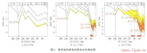 2)各凹陷烴源巖的熱演化過(guò)程有3種類型:濟(jì)寧、巨野凹陷為印支期一次生烴型,生烴能力極差,對(duì)該區(qū)煤成氣成藏貢獻(xiàn)不大;汶上凹陷為印支一喜馬拉雅山期二次生烴型,但僅局部達(dá)到二次生烴條件,生烴潛力有限;黃口、成武、魚臺(tái)等凹陷為印支一燕山期、喜馬拉雅山期二次生烴型,烴源巖大面積成熟,生烴潛力最大。