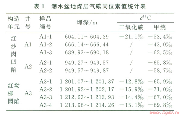 該區(qū)宏觀煤巖類型以暗淡煤和半暗煤為主,顯微煤巖組分鏡質(zhì)組含量低,生氣母質(zhì)條件較差;煤巖變質(zhì)程度低,為低煤階,熱成因氣量少,因此低煤階煤層氣成藏須要生物氣的補(bǔ)充。目前,國內(nèi)外學(xué)者普遍采用甲烷碳同位素值(δ13C1)來鑒別生物氣[9-11]。l989年,戴金星通過研究我國生物氣的氣組分及同位素組成特征,提出以δ13C1<-55‰作為鑒別生物氣的主要地化指標(biāo)[12]。