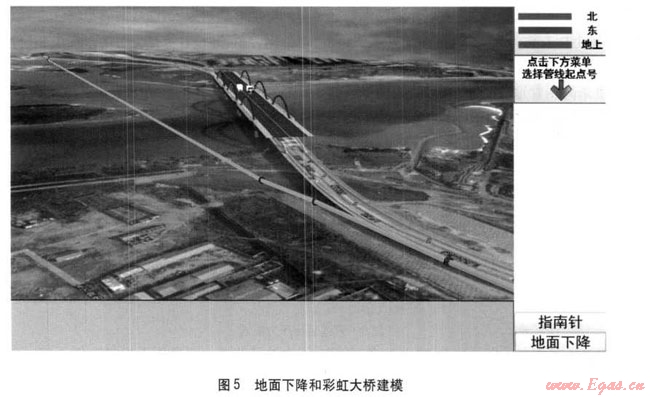 通過點擊“地下管道”,地面會“下降”,將地下管道顯示出來,通過地面下降可以清楚地看到管道的位置,周邊的建筑情況(見圖5)。