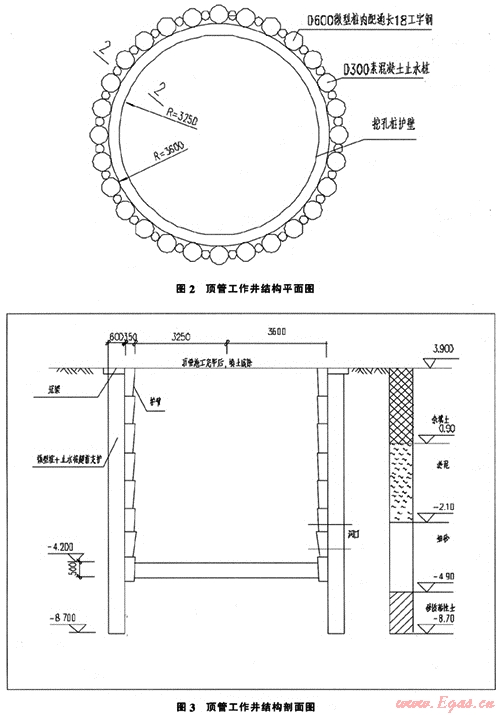 工作井樁徑D=600mm,接收井樁徑D=400mm,樁長均為12m,內(nèi)置18工字鋼,通長配置。工作井沿直徑D=7.8m圓周均勻布置28根樁,接收井沿直徑D=5.1m圓周均勻布置24根樁,樁身混凝土強(qiáng)度:C20。