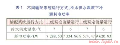 不同輸配系統(tǒng)運行方式、冷水供水溫度下冷源耗電功率見表l。當冷水供水溫度為