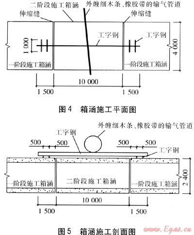 首先調(diào)整箱涵設(shè)計標(biāo)高,使箱涵與輸氣管道垂直凈距不小于50cm,垂直方向保證足夠的安全距離和操作空間。再調(diào)整箱涵伸縮縫位置,使輸氣管道位于一節(jié)箱涵的中間。