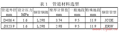 設(shè)計強度系數(shù)可根據(jù)《城鎮(zhèn)燃氣設(shè)計規(guī)范》(GB50028—2006)的分級地區(qū)選取合理系數(shù),高壓、次高壓管道已采用了較高等級的材料,焊接系數(shù)取1。如寶雞市天然氣三期利用工程就使用D406.4螺旋縫埋弧焊鋼管和D323.9直縫埋弧焊鋼管,材質(zhì)L290MB,B級鋼管,設(shè)計壓力1.6MPa,壁厚根據(jù)管線敷設(shè)所在不同地區(qū)劃分標準(考慮了今后發(fā)展),其選取如表1所示: