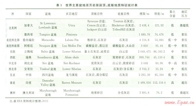 筆者通過文獻調研[5],對全球主要盆地含氣泥頁巖層段(系統(tǒng))頂、底板的地質特征進行了統(tǒng)計。結果顯示(表1),世界范圍內(nèi)主要盆地頁巖地層頂、底板巖性以致密的泥頁巖、膏泥巖、膏鹽層、石灰?guī)r、白云巖、火山巖、煤層等為主,屬于非滲透或低滲透巖層。其埋深范圍從l