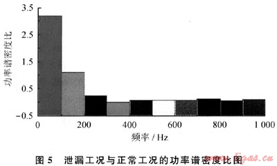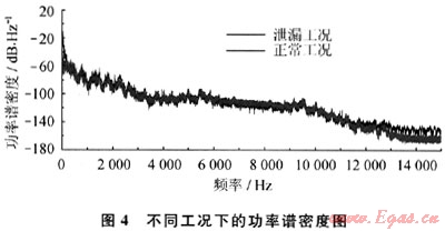 從圖4可以看出,泄漏工況的功率譜和正常工況的功率譜在很長的頻率段上是基本重合的,只是在起點(diǎn)附近兩者有所不同。隨著頻率的增大,不論是泄漏工況還是正常工況,其功率譜密度都逐漸減小,最終逐漸趨于穩(wěn)定,即高頻部分基本為白噪聲部分。