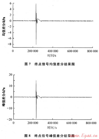 從上面對(duì)音波信號(hào)的時(shí)域和頻域分析中可以看出,信號(hào)的幅值和功率譜密度是可以作為泄漏判斷的特征量的,這驗(yàn)證了1.1節(jié)的分析結(jié)果。除此之外,1.1節(jié)提出的相鄰區(qū)間信號(hào)累加差分、均值差分、峰值差分的特征識(shí)別方法,也可以作為泄漏檢測的判斷依據(jù)。當(dāng)管道起點(diǎn)壓力為4.6MPa左右,泄漏孔徑為0.45mm時(shí),將泄漏點(diǎn)1發(fā)生泄漏時(shí)采集到的測試管段終點(diǎn)的聲壓進(jìn)行去噪,根據(jù)提出的相鄰區(qū)間信號(hào)累加差分、均值差分、峰值差分的算法,可分別得到終點(diǎn)信號(hào)累加差分結(jié)果如圖6所示,終點(diǎn)信號(hào)均值差分結(jié)果如圖7所示,終點(diǎn)信號(hào)峰值差分結(jié)果如圖8所示。