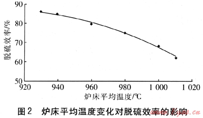 ② 爐床溫度對(duì)脫硫效率影響顯著。隨著爐床溫度的上升,脫硫效率幾乎呈線性下降。
