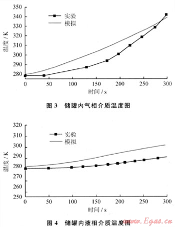 圖3、4分別為氣相介質和液相介質的溫度響應過程,計算值與實驗值吻合較好,最大誤差分別為4.5%和4%。其中,氣相取距離儲罐頂部50mm處的介質溫度,液相取距離儲罐底部200mm處介質的溫度。由圖3和圖4對比可知,液相介質的溫度升高較氣相介質緩慢,300s內氣相介質和液相介質的溫度分別升高了63K和11K。原因在于一方面蒸汽的比熱容遠小于液相的[2];另一方面液相介質過熱后會通過相變將熱量轉化到氣相,使得液相介質本身儲存的熱量較少。