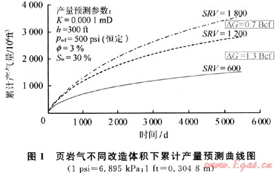 頁巖氣儲層滲透率超低,厚度大,天然裂縫發(fā)育,氣體主要以吸附態(tài)吸附在有機質(zhì)表面,常規(guī)改造形成單一裂縫很難獲得好的增產(chǎn)效果。數(shù)值模擬研究表明[3],頁巖氣儲層改造的體積(SRV,106ft3;1ft3=0.028317m3,下同)越大,壓后增產(chǎn)效果越好(圖1)。但要實現(xiàn)體積改造,除地層要具備體積壓裂的基本條件外,壓裂改造工藝方法也十分關(guān)鍵。
