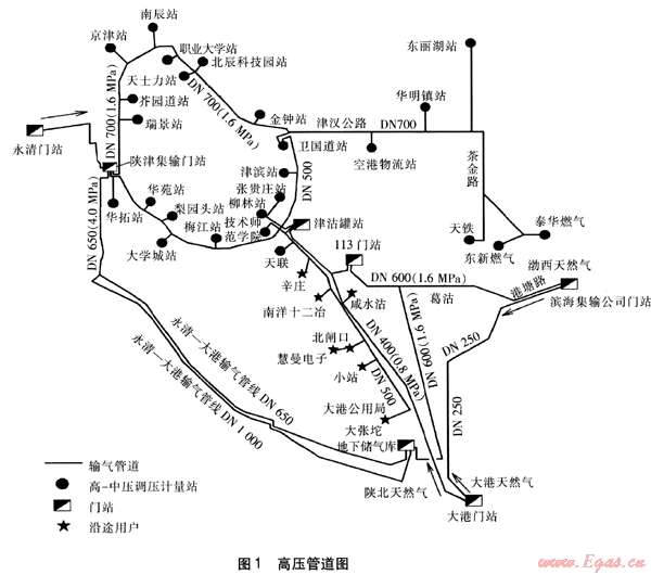 輸配分公司管理的4條輸氣管道納入集團公司封閉計量考核范圍,即“45km輸氣管道”及南、北半環(huán)輸氣管道(見圖1,圖中所標壓力為運行壓力)。“45km輸氣管道”是指由大港門站至津沽罐站DN 400mm管道及津沽罐站至大港公用局DN 500mm管道,設(shè)計壓力、運行壓力均為0.8MPa,兩條管道長度各約45km。南半環(huán)是指由陜津集輸門站沿外環(huán)線以南至衛(wèi)國道高-中壓調(diào)壓站的管道,設(shè)計壓力、運行壓力均為0.8MPa,長度為37.16km。北半環(huán)是指由陜津集輸門站沿外環(huán)線以北至衛(wèi)國道高-中壓調(diào)壓站及泰華燃氣、東麗湖高-中壓調(diào)壓站的管道,設(shè)計壓力為2.5MPa,運行壓力為1.6MPa,長度為66km。
