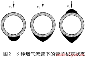 煙氣中攜帶的飛灰及催化劑粒徑一般都小于200μm,大部分是10~20μm的顆粒。當含灰的氣流沖刷管束時,產(chǎn)生旋渦區(qū),大顆粒由于慣性大,不易進入旋渦,進入旋渦區(qū)的大部分為微小顆粒。在分子力吸附作用和靜電力的作用下,遇到低溫受熱面管壁便聚積下來。松灰呈干松狀,易吹除,但其熱阻很大,對傳熱有很大影響[3]。積灰主要在管子背風(fēng)面形成,當煙氣流速較大時,迎風(fēng)面基本沒有積灰,因此積灰程度與煙氣流速有關(guān)。3種煙氣流速下管子的積灰狀態(tài)見圖2。圖中,v1>v2>v3。對于最高的煙氣流速v1,管子積灰最少,v2積灰較多,v3積灰最嚴重。因此,煙氣流速越大,在管子的背風(fēng)面越不易積灰。