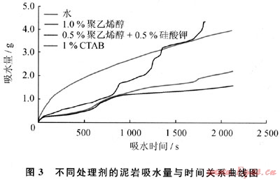 對比吸水量與時間關系曲線可知,泥巖在清水中的吸水量上升的最快,同一時間內(nèi)吸水量也最大。從總吸水量上來看,聚乙烯醇大于CTAB潤濕反轉劑,大于聚乙烯醇和硅酸鉀混合溶液,說明聚乙烯醇和硅酸鉀混合溶液的抗毛細管力自吸能力很好。CTAB潤濕反轉劑相對封堵型的處理劑,吸水量還是略高,抑制效果稍差。通過此項實驗,能有效地模擬評價處理劑抑制泥頁巖自吸水的性能。