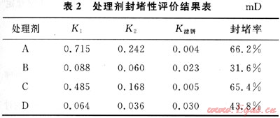 實驗中采用代號為A、B、C、D的4種處理劑,在3.5MPa循環(huán)壓力下對取自井下同一深度的巖心進行了封堵效果測試,結果見表2。