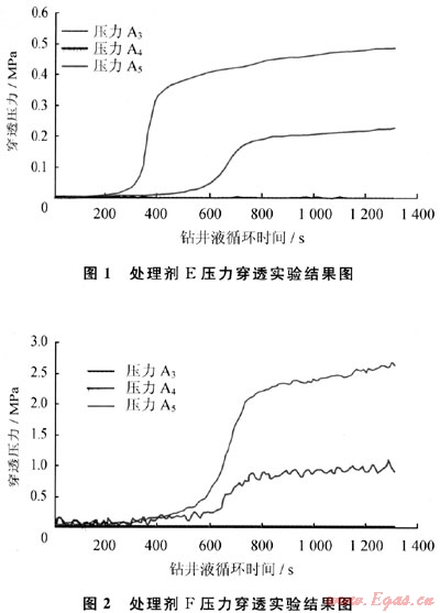 實驗采用處理劑E、F對同一深度的井下巖心進行了壓力穿透測試,結果見圖1、2。