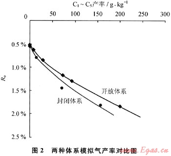 烴源巖在降解生油的同時(shí)生成烴類氣體(圖2)。隨熱演化程度增高,開放體系和封閉體系的烴氣產(chǎn)率大致按相近的趨勢增長,在達(dá)生油高峰之前(Ro<1.O%)二者差別不大,但其后差別逐漸明顯。在相同的成熟階段封閉體系比開放體系氣產(chǎn)率略低,說明壓力的存在對氣體的生成有一定抑制作用。前人大多認(rèn)為封閉體系與開放體系相比,由于二次裂解生成的氣體較多,這應(yīng)與實(shí)驗(yàn)中實(shí)現(xiàn)的條件有關(guān)。本次封閉體系的實(shí)驗(yàn)中,烴源巖樣品位于反應(yīng)區(qū),其生成的油氣從樣品排出后由于存在流體壓力的調(diào)整(恒定壓力)及上浮現(xiàn)象會(huì)繼續(xù)運(yùn)移遠(yuǎn)離反應(yīng)區(qū),在高壓釜溫度相對較低的上下端部儲(chǔ)集起來。因此這是一個(gè)與地下條件較為接近的生排烴動(dòng)平衡過程。