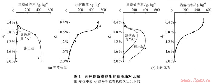在兩種體系的模擬實(shí)驗(yàn)中形成了不同數(shù)量的重質(zhì)油,并以不同效率的排出(圖1)。開放體系生成的重質(zhì)油,殘留的部分(即氯仿瀝青“A”含量)較少,只在Ro=0.6%附近呈略微增高的趨勢,其后隨演化一直處于下降階段。在Ro=0.5%之后即開始排油,主生油階段大部分重質(zhì)油即已排出,是由于其生成以后缺少壓力的抑制作用所致。重質(zhì)油總量在Ro=1.0%之前增加速度較快,Ro=1.0%時(shí)的高演化階段變化趨于平緩。這種情形與地下差別較大,即地下烴源巖的生排烴不可能處于完全開放的體系中。
