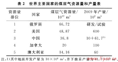 世界主要國家煤層氣資源量和產(chǎn)量情況如表2所示。