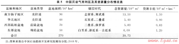中國海相地層沉積面積達300×104km2,其中陸上海相沉積達280×104km2。據(jù)2006年中國石油的研究成果,中國頁巖氣資源量為100×1012m3;近期有利地區(qū)頁巖氣資源量在30×1012m3左右(表5)。