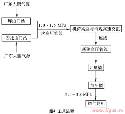 該方案只需煙廠專用調(diào)壓站后的次高壓管線與機荷高速、坂雪大道、環(huán)觀南路、平大路的高壓管線聯(lián)通,目前只需建設(shè)6.42km,即可聯(lián)通,從工期上來說,應(yīng)可以滿足需求。電廠內(nèi)需建設(shè)計量撬、加壓撬,工藝流程見圖4。