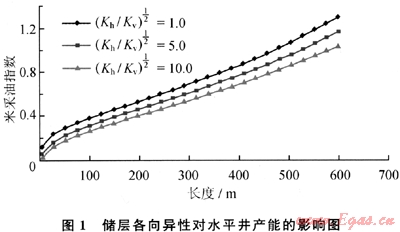 通過對(duì)水平井?dāng)M三維產(chǎn)能方程進(jìn)行離散得出了不同各向異性系數(shù)(水平滲透率與垂向滲透率比值的開方)下,水平井長度和米采油指數(shù)的關(guān)系。