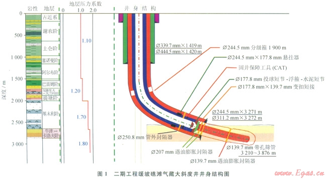 阿姆河右岸鉆遇地層具有“高壓淺層次生氣藏、高壓鹽水層、高壓目的層、高產(chǎn)儲(chǔ)層、巨厚鹽膏巖”等“四高一厚”的特征,嚴(yán)重影響高效、安全鉆井(前蘇聯(lián)在此鉆井期問(wèn)事故頻發(fā),鉆井周期長(zhǎng),工程報(bào)廢率高達(dá)30%)。同時(shí),為了實(shí)現(xiàn)稀井高產(chǎn)、高效開(kāi)發(fā)的目的,需要大規(guī)模實(shí)施大斜度井整體開(kāi)發(fā),造斜增斜段均在鹽膏巖中,對(duì)井眼軌跡控制提出了更高要求。①在設(shè)計(jì)階段,地質(zhì)考慮工程施工難度,盡可能避開(kāi)淺層走滑斷層、次生人工氣藏區(qū)及高壓鹽水層等非目的層復(fù)雜帶,根據(jù)地質(zhì)特征,共同確定井身結(jié)構(gòu)和井眼軌跡;工程考慮地質(zhì)和開(kāi)發(fā)需要,在儲(chǔ)層變化大的地區(qū),先鉆導(dǎo)眼,搞清儲(chǔ)層分布,然后再側(cè)鉆確保鉆探效果,完井滿(mǎn)足后期生產(chǎn)作業(yè)的需要。②在實(shí)施階段,非目的層鉆進(jìn)期問(wèn),地質(zhì)要為工程服務(wù),做好層位預(yù)測(cè)、卡準(zhǔn)中完井深、特殊巖性預(yù)報(bào)、壓力預(yù)測(cè)等,規(guī)避鉆完井風(fēng)險(xiǎn),目的層鉆進(jìn)期問(wèn),丁程為油氣發(fā)現(xiàn)、安全作業(yè)服務(wù),尤其是精細(xì)控壓、地質(zhì)研究、人斜度井水平井軌跡控制、儲(chǔ)層保護(hù),確保鉆井目的實(shí)現(xiàn)。尤其是強(qiáng)化隨鉆分析,實(shí)時(shí)跟蹤,及時(shí)優(yōu)化調(diào)整,重點(diǎn)工序和關(guān)鍵環(huán)節(jié)地質(zhì)工程駐井現(xiàn)場(chǎng)辦公,及時(shí)決策,確保優(yōu)質(zhì)安全。通過(guò)實(shí)施地質(zhì)工程一體化,鉆井成功率為100%,大斜度井(見(jiàn)圖l)、水平井全部獲得高產(chǎn),單井無(wú)阻流量900×l04~l500×104m3/d,為高效開(kāi)發(fā)奠定了堅(jiān)實(shí)的基礎(chǔ)。