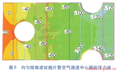 空氣進口速度為4m/s時,兩種波紋翅片管空氣通道中心面的壓力(表壓)場分別見圖6、7,圖中數(shù)值單位為Pa。由圖6、7可知,兩種波紋翅片管的壓力分布均比較紊亂。傾角漸增波紋翅片管空氣通道中心面的壓力降要大于均勻傾角波紋翅片管,且隨著翅片傾角的增大,等壓線分布更加稠密。原因是傾角漸增波紋翅片結(jié)構對流體的阻滯和擾動作用都較大,阻力比均勻傾角波紋翅片管大。